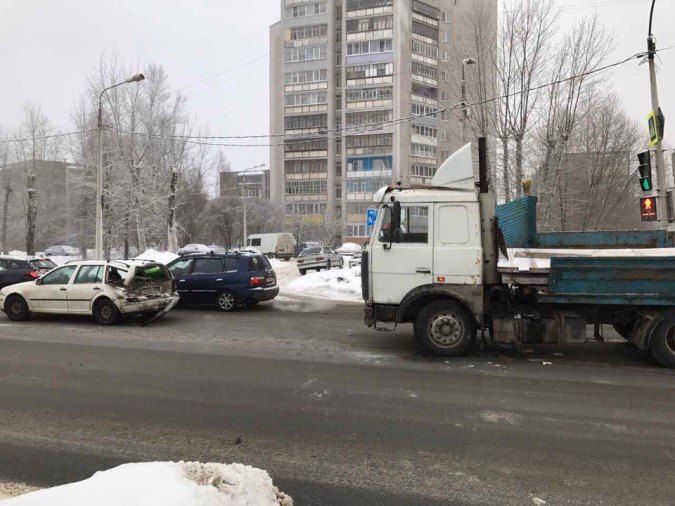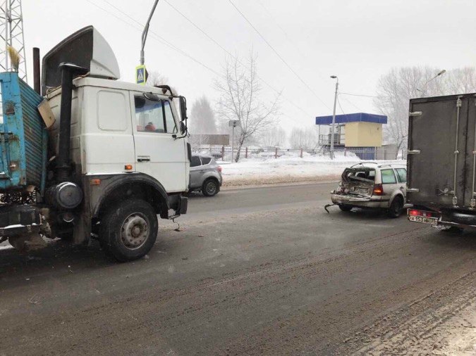 Возле дома номер 15 по Северному шоссе, в 10:35, по данным ГИБДД, произошла авария. Водитель автомобиля «МАЗ» не рассчитал траекторию при повороте налево и врезался в заднюю часть «Фольксваген Гольф». В результате ДТП пассажирка фольксвагена отправлена в больницу, она получила травму позвоночника.