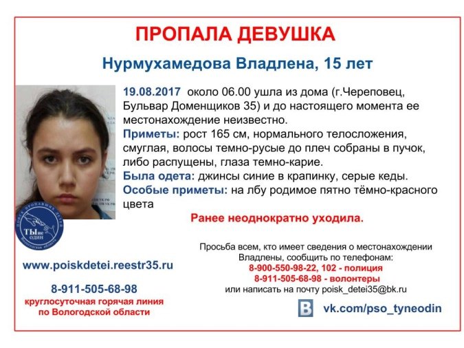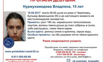 В Череповце пропала 15-летняя девушка. 19 августа она ушла из дома и обратно не вернулась.