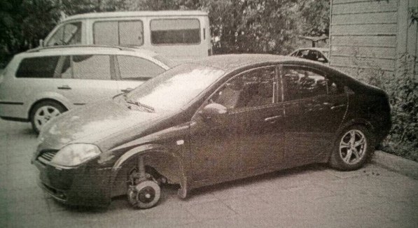 Сегодня ночью в Череповце неизвестные сняли с иномарки передние колеса. Теперь хозяйка вместе с полицейскими по всему городу ищет пропажу.