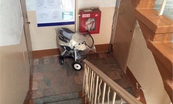 В результате, коляска сильно повреждена, а стены подъезда покрылись копотью.