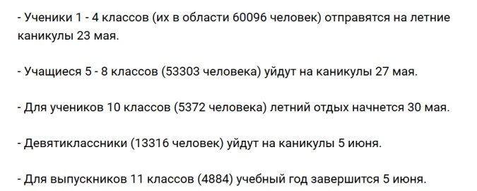 Источник напоминает, что в связи с эпидемией учебный год в регионе не может завершиться в привычном режиме, как это было раньше. Губернатор заявил, что ученики в этом году отправятся на каникулы раньше обычного.